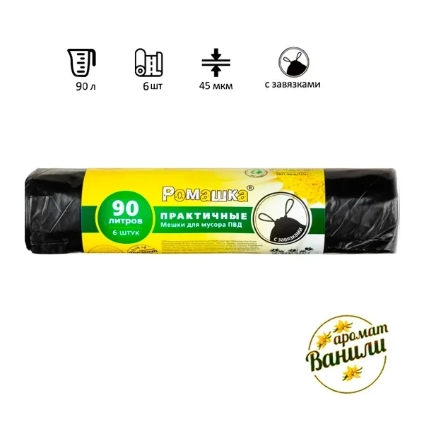 Мешки для мусора Ромашка Эконом 60л, ПНД, 58х68см, 6мкм, 20шт, 4.5г, черного цвета, в рулоне