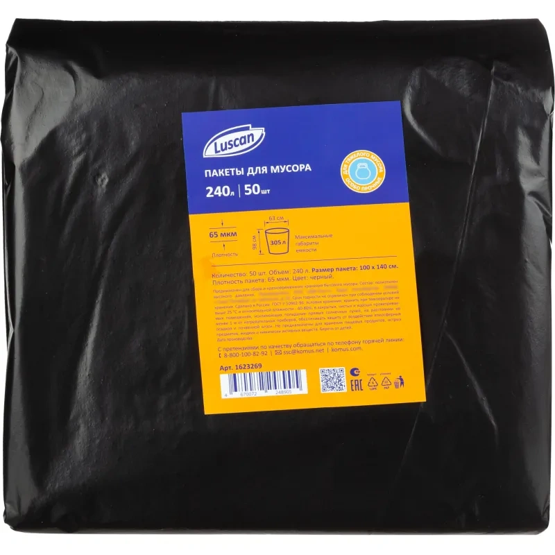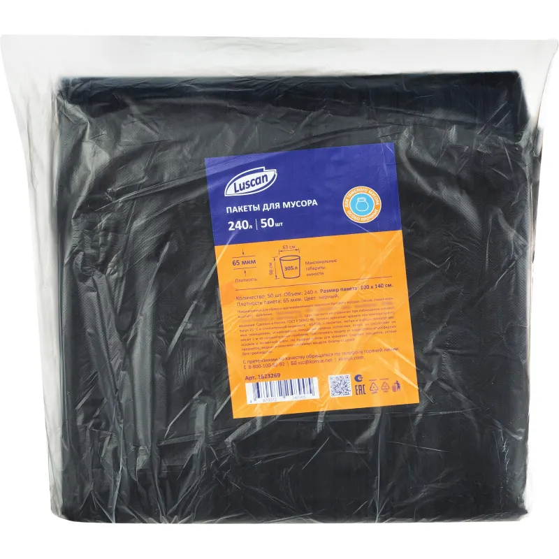 Мешки для мусора ПВД 240л 100х140см 65мкм черного цвета 50 шт Luscan