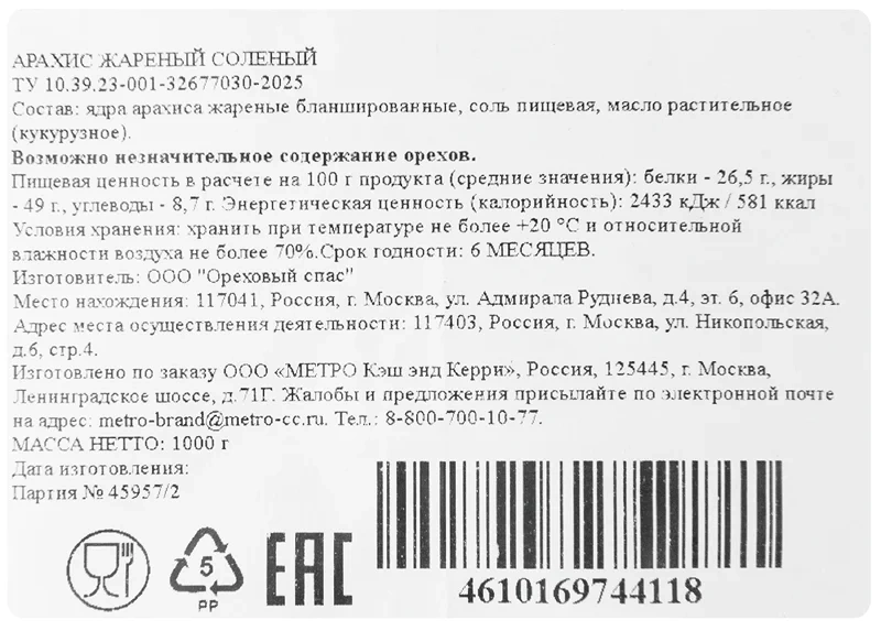 Ядра бразильского арахиса равномерно прожарены и просолены. Полностью готово к употреблению.