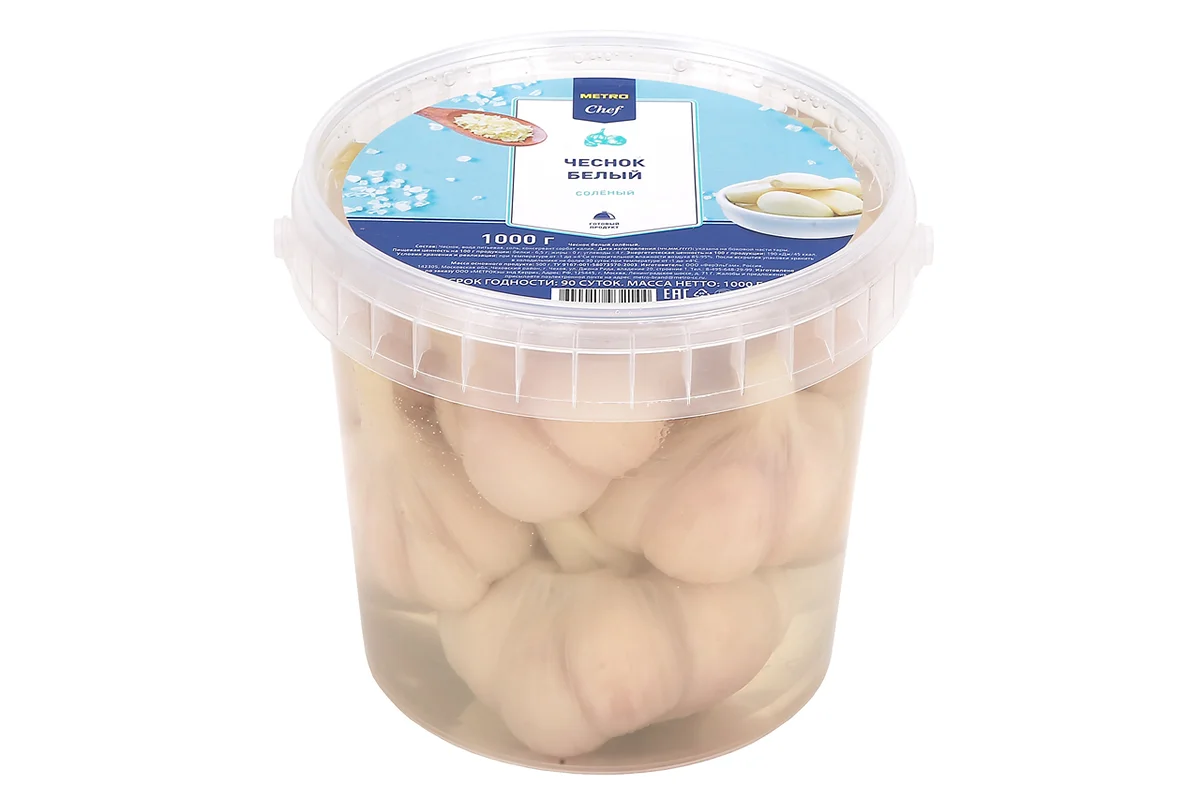 METRO Chef Чеснок соленый белый, 1 кг - полуфабрикат, готовый к употреблению. Без этого овоща с пикантным ароматом и острым вкусом не обходится почти не одно блюдо. Его используют при засолке и в процессе создания различных маринадов, добавляют в первые и вторые блюда, сопровождают им закуски и добавляют в масло для аромата. Без чеснока не мыслим плов, закуска с сыром, а также котлеты и прочие деликатесы из мяса. Его применяют как в свежем, так и в сушеном виде. В чесноке много витаминов, поэтому он выступает прекрасным средством в борьбе в осенне-зимнее время с авитаминозом. Есть в нем железо, йод и фосфор, а также масса полезных для организма человека макро- и микроэлементов. Соленый чеснок станет отличной закуской как на повседневном, так и на праздничном столе. Его вкусно добавить в винегрет и квашеную капусту. Ассортимент торговой марки METRO Chef представлен всем, что необходимо для удовлетворения кулинарных потребностей разных категорий покупателей. Под этим брендом выпускаются продукты, которые были созданы шеф-поварами, специально для настоящих ценителей и знатоков кухни. В линейке можно найти большой выбор товаров из Европы и Азии. Это молочные продукты, бакалея и пасты, мясо и птица, морепродукты и креветки, замороженные овощи, чай, кофе и какао и многое другое.