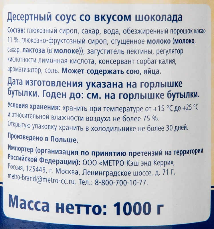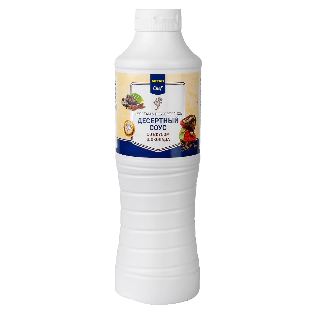 METRO Chef Десертный соус со вкусом шоколада, 1кг универсальная основа для приготовления различных сладких блюд. В составе продукта присутствует много натурального шоколада, что делает его вкус особенно насыщенным и пикантным. Продукт обладает густо, тягучей текстурой, может подаваться в качестве подливки к блинам, сырникам, запеканкам, мороженому, вафлям или просто намазываться на сдобную булку. Отлично подходит в качестве соусов для фруктовых салатов, приготовления сладких шейков и коктейлей. Используется как добавка к напиткам или украшение. Может добавляться в домашние кремы и йогурты.