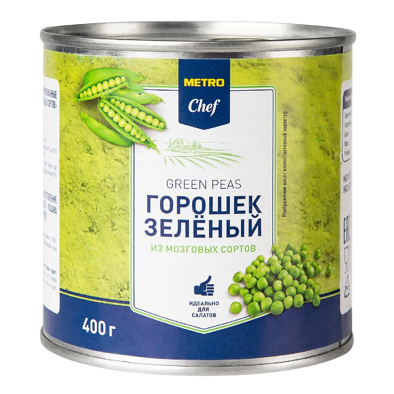 Зеленый горошек Metro Chef обладает сладким и нежным вкусом. Зеленый горошек идеально подходит для приготовления салатов и закусок. Он также идеально подойдет в качестве гарнира к мясу или рыбе.