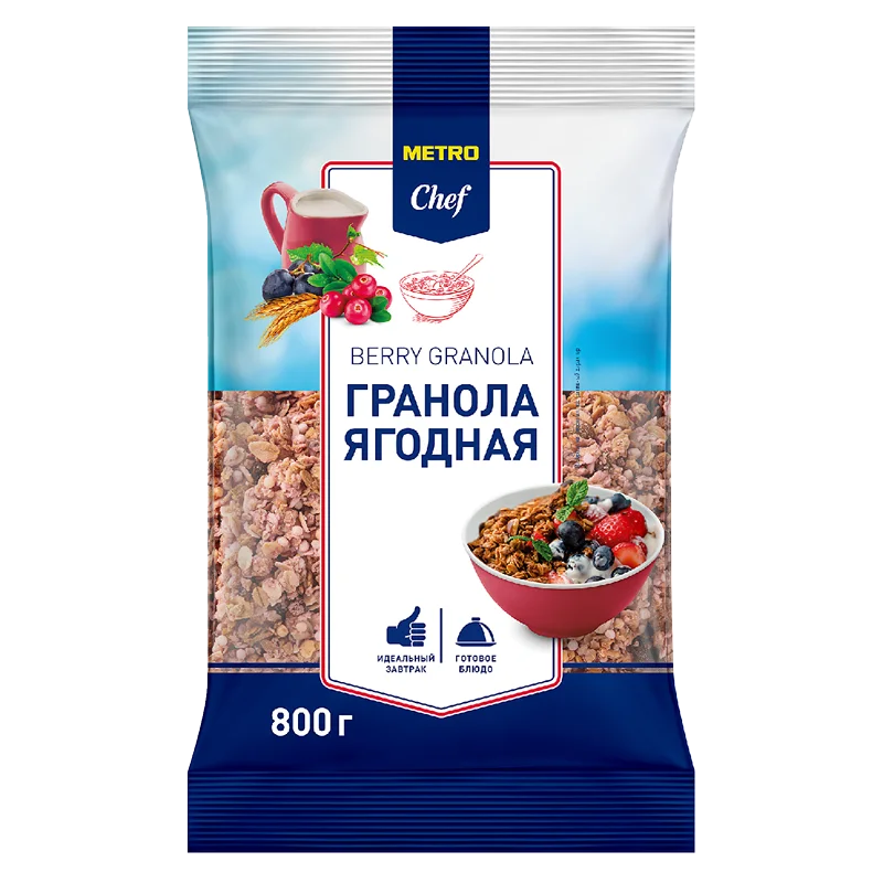 Ягодная гранола Metro Chef - это идеальный баланс хрустящих овсяных хлопьев и сочных сушеных ягод. Терпкость клюквы и нежность винограда в совокупности с воздушными рисовыми шариками. Гранола - это отличное начало дня, она богата клетчаткой и витаминами, дарит заряд бодрости на весь день. Идеально сочетается с йогуртом, молоком, смузи или в качестве хрустящего топпинга для десертов.