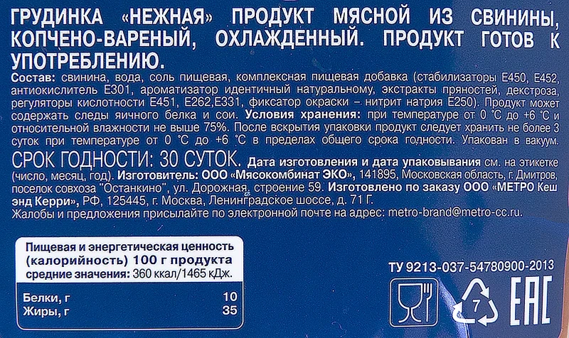 Грудинка Нежная варено-копченая Metro Chef, весовой– копчено-вареный деликатес, изготовленный из отборного свиного мяса. Он отличается нежным и насыщенным, в меру солоноватым вкусом с пикантной ноткой копченостей. Такой продукт можно подавать в виде нарезки на праздничный стол, использовать для приготовления салатов, сэндвичей, бутербродов, канапе и других легких и сытных закусок. Грудинка хорошо и быстро усваивается, моментально утоляя голод и восполняя утраченные силы. Употребление этого продукта не только насыщает, но и приносит пользу организму. В грудинке содержится незаменимый для здоровья белок, витамины группы В, РР и Е, калий, натрий, фосфор, хлор, цинк и другие микро- и макроэлементы. Благодаря богатому составу продукт положительно сказывается на состоянии сердца и сосудов, улучшает состояние костной и мышечной ткани, нормализует обмен веществ, укрепляет иммунитет.