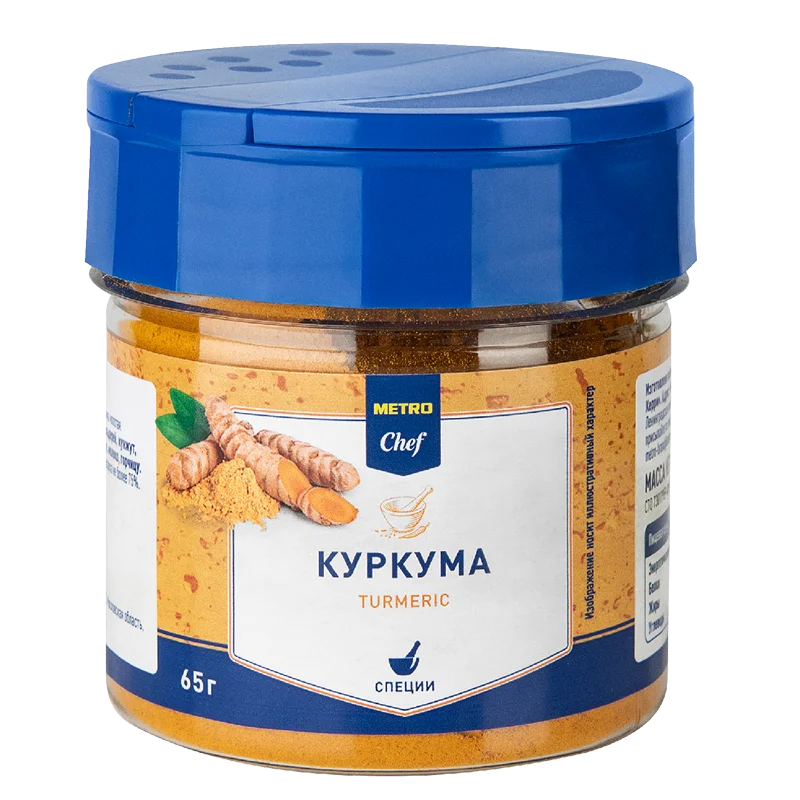 Популярная восточная пряность, которая получается при переработке корней одноименного растения. Их варят, сушат и очищают, в результате чего получаются твердый и плотный корни ярко-оранжевого цвета, которые перемалывают в порошок, напоминающий тончайшую пудру. Куркума добавляется в блюда в небольших количествах. Она является отличной приправой к соусам, супам и салатам из овощей. Кроме того, молотая пряность становится отличным дополнением к различным блюдам и бульонам из птицы. Благодаря ей пища приобретает острый вкус, приятный аромат и насыщенный желтый цвет.