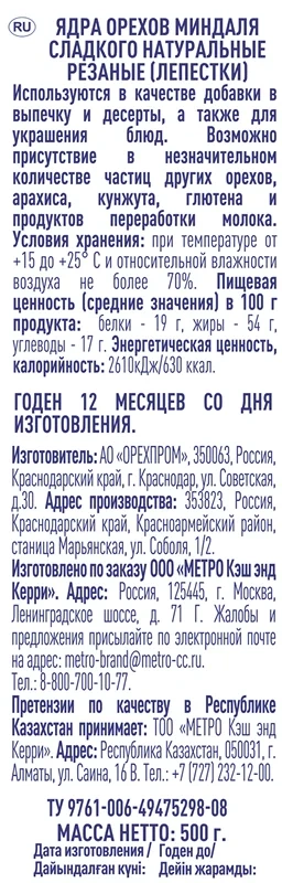 METRO Chef Лепестки миндальные резаные, 500 г – незаменимый компонент не только для десертов, но и для многих других блюд. Миндаль имеет ярко выраженный и насыщенный вкус, поэтому он нередко входит в мясные, рыбные и овощные рецепты. Миндальные лепестки – это тонко нарезанные слайсы обжаренного миндаля. Они зачастую используются для оформления кондитерских изделий: тортов, пирожных, пирогов и прочих десертов. Миндальные лепестки придают лакомству не только соблазнительный внешний вид, но и пикантный вкус с оригинальным послевкусием. Ко всему прочему миндаль как орех богат полезными витаминами и минералами. Его в умеренном количестве рекомендуется включать в ежедневный рацион. После вскрытия упаковки продукт следует пересыпать в емкость с плотн?? завинчивающейся крышкой.