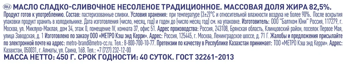 Масло сливочное Metro Chef Традиционное ГОСТ, 82.5%, 450г