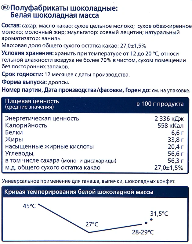 METRO Chef Масса шоколадная белая в галетах, 1.5кг представляет собой термостабильный твердый шоколад высокого качества с высоким содержанием какао. Он отличается мягким, нежным вкусом с легкой ноткой терпкости и приятным ароматом, который может понравиться всем членам семьи. Продукт хорошо держит форму и не образовывает бледного налета. В состав входят только свежие натуральные ингредиенты. Дропсы можно использовать в кулинарном деле. Они идеально подойдут для украшения тортов, кексов, добавления в выпечку, крема, муссы, горячие и холодные напитки. В состав входят множество растительных волокон, макро- и микроэлементов, полезных для организма человека. Умеренное потребление продукта улучшает работоспособность, концентрацию внимания и стимулируют умственную деятельность.