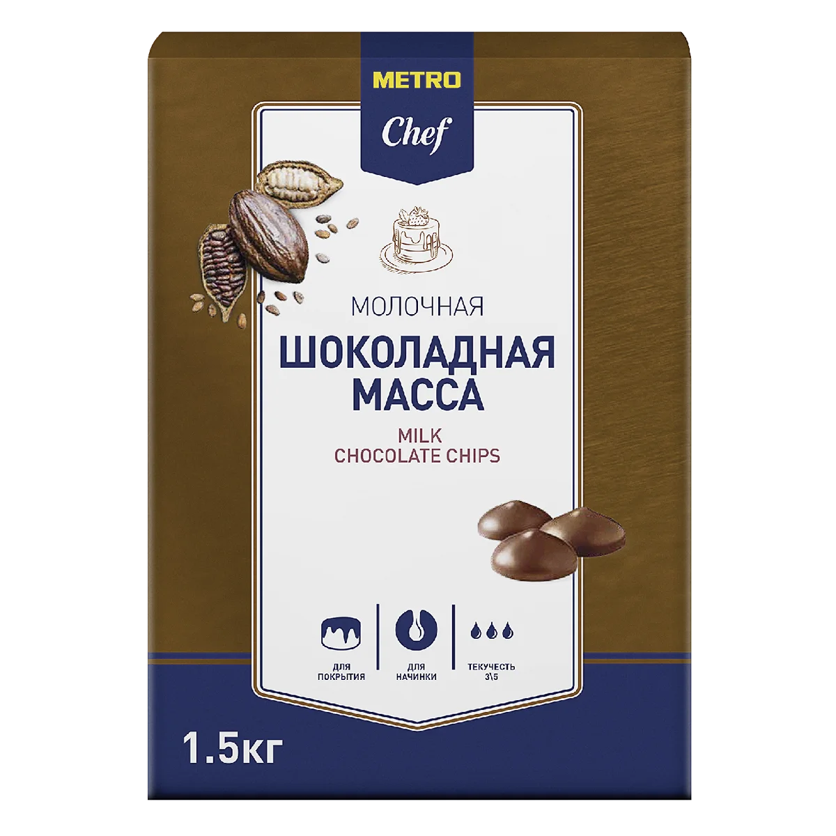 Metro Chef Масса шоколадная молочная дропсы, 1.5кг - это продукт, который имеет широкое применение и без которого не могут обойтись ни профессиональные кондитеры, ни кондитеры-любители. Шоколадную массу METRO Chef можно нагревать и использовать для приготовления начинки для десерта ' Фондан', различных форм из шоколада, муссов, ганашей и соусов.