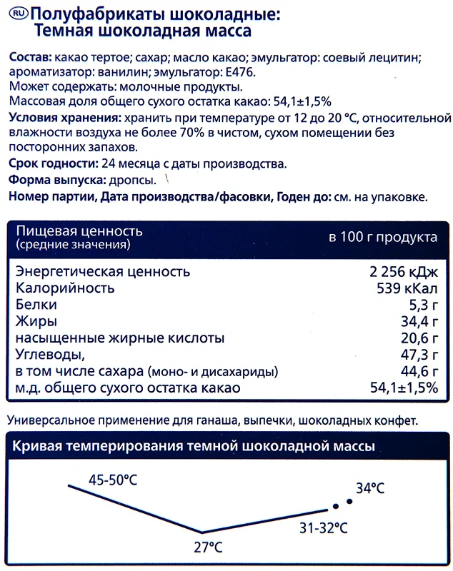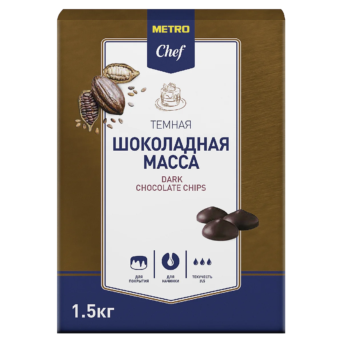 Темная шоколадная масса - это продукт, который имеет широкое применение и без которого не могут обойтись ни профессиональные кондитеры, ни кондитеры-любители. Шоколадную массу METRO Chef можно нагревать и использовать для приготовления начинки для десерта ' Фондан', различных форм из шоколада, муссов, ганашей и соусов. Шоколадная масса METRO Chef представляет собой небольшие кусочки шоколада в форме 'каллетс',что позволяет отмерить более точное количество шоколада, которое нужно для десерта, а также маленькие кусочки позволяют быстрее расплавить шоколад.