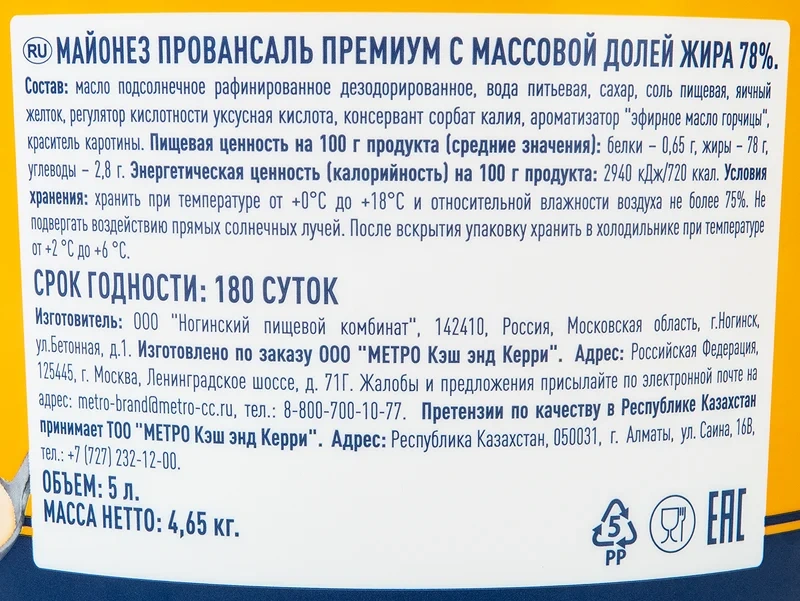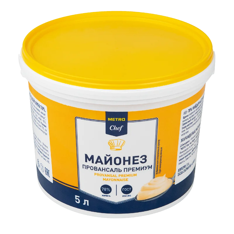 Metro Chef Майонез Провансаль 78%, 5л в пластиковом ведре удобен для профессионального использования. Обладает насыщенным вкусом, жирной, густой консистенцией, сделан из яичных желтков и универсален в применении - его можно использовать и для простых домашних рецептов, и для сложных профессиональных блюд. Майонез 78% особенно хорош для запекания, равномерно распределяется и держит форму. Его также можно использоваться как густую заправку для салатов, в качестве соуса для горячих блюд, для приготовления других соусов.