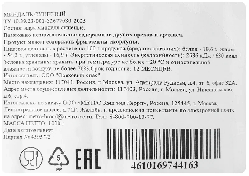 Большая упаковка сушеного миндаля METRO CHEF. Орех откалиброван и готов к употреблению.