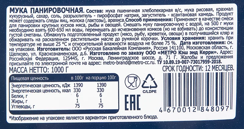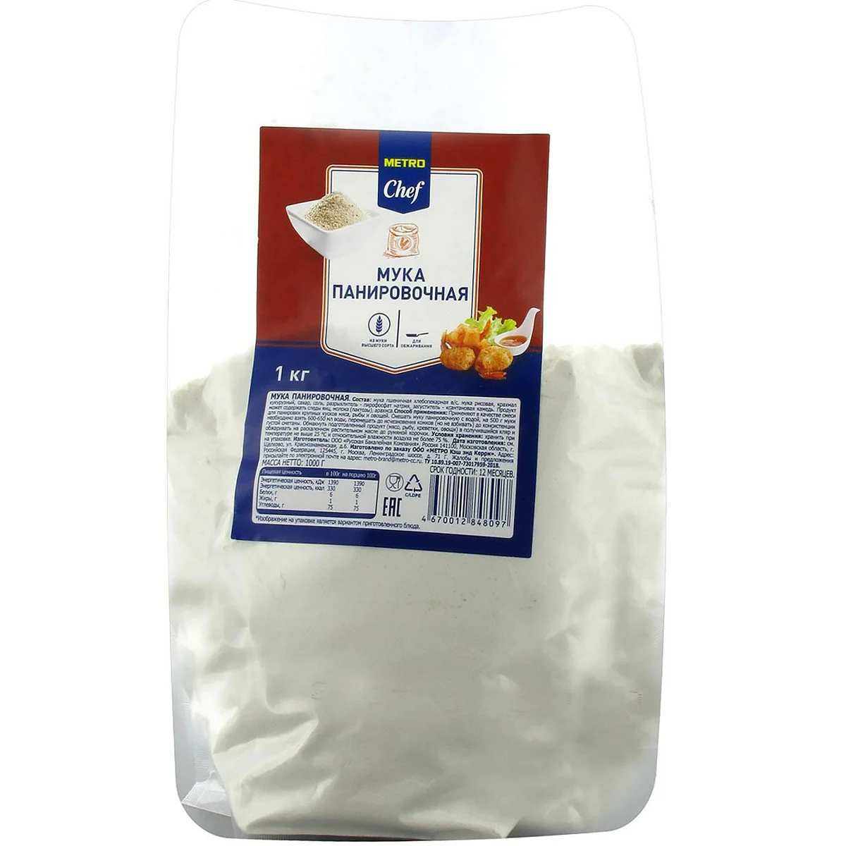 Мука Metro Chef панировочная, 1 кг производится из пшеничной и рисовой муки с добавлением кукурузного крахмала, соли и сахара. Ее можно применять для обсыпки обжариваемых или приготавливаемых во фритюре блюд. Отлично подходит для изделий из рыбы, овощей, мяса, птицы. Такая мука придает готовым продуктам презентабельный внешний вид, создает на поверхности аппетитную тонкую хрустящую корочку, снижают потерю влаги, позволяя мясу или рыбе оставаться сочным и нежным. Также подходит для блюд из фарша.