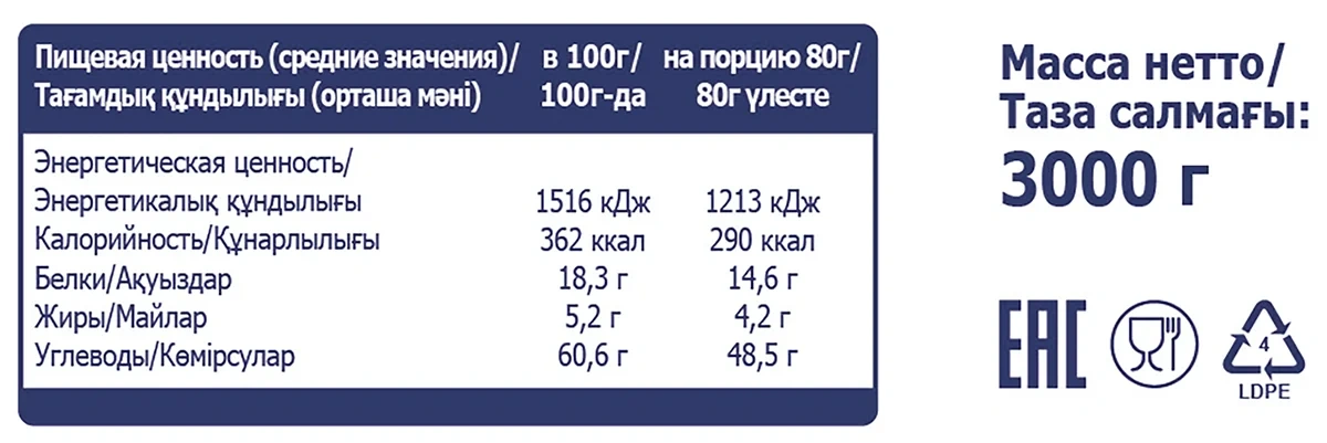 | Энергетическая ценность, ккал/100 г | 362 |