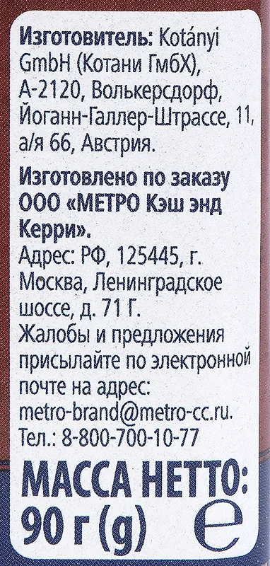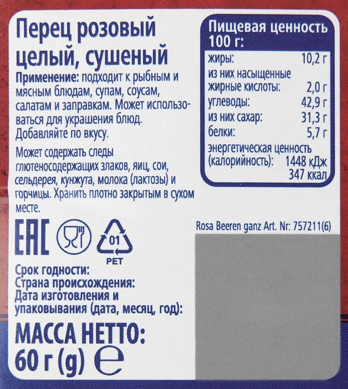 METRO Chef Перец розовый, 90г — ягоды экзотического дерева шинус, которое растет в Южной Америке. Свое название они получили только из-за сходства с перцем по внешнему виду. Данная приправа, в отличие от перца, совсем не острая. Ее применяют в кулинарии из-за привлекательного внешнего вида — гладкие блестящие горошины ярко-красного или ярко-розового цвета диаметром 3-5 мм помогают украсить любое блюдо. Плоды розового перца практически не имеют запаха, но если их размолоть или растереть, появится еле ощутимый сладковато-перечный аромат. Вкус специи сладкий и свежий со смолистыми нотками и легким смолистым послевкусием. В кулинарии розовый перец чаще используется во французской, южноамериканской и средиземноморской кухнях. Он гармонично сочетается с другими видами перца (черным, белым, зеленым), поэтому часто входит в составы смесей. Представленный продукт хорошо дополняет вкус блюд из мяса, рыбы и птицы, а также соусов и маринадов, десертов и напитков.
