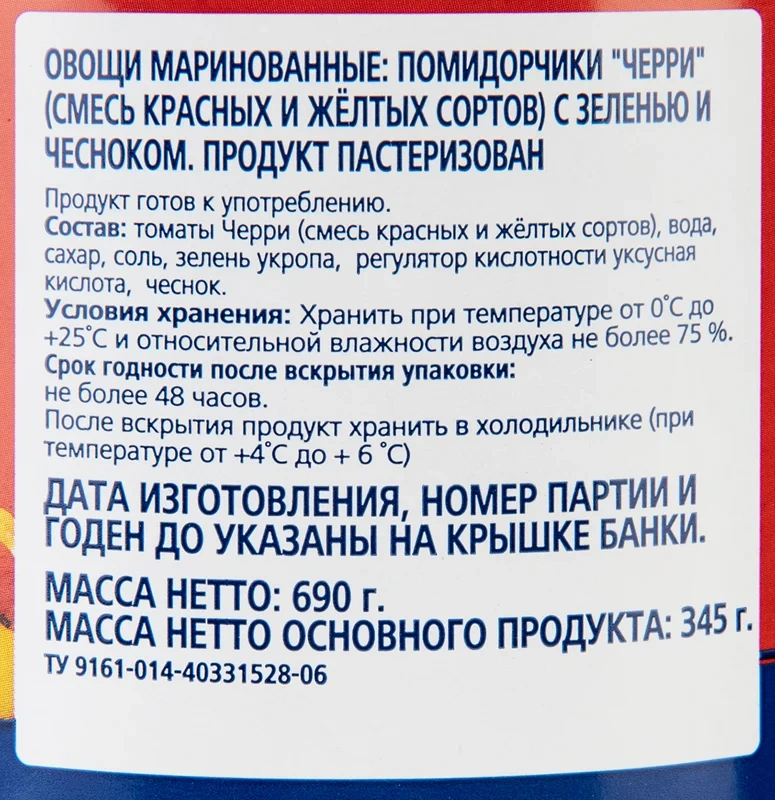 Помидорки черри элитных красных и желтых сортов, выращенные на российских полях, в мягком маринаде с зеленью и чеснком. Сочетание оенных вкусовых качеств и красивого внешнего вида делает продукт украшением стола. Отличаются нежной сочной текстурой и приятным ярким вкусом. Они очень аппетитно выглядят, прекрасно сочетаются с любым мясным или овощным блюдом, а так же с разнообразными салатами и холодными закусками, и совершенно не требуют дополнительной обработки. Небольшие томаты выглядят очень эффектно и могут украсить обеденный стол. Это диетический продукт, поэтому он идеально подходит для постного и вегетарианского меню. Маленькие помидорчики черри поистине медовые на вкус, мы называем их медовые, потому что наш маринад придает им еще большую сладость. Вкус томатов выраженный, природная сладость помидора сбалансирована уксусной составляющей и подчеркнута ярким букетом специй. Томаты черри подойдут в качестве легкой закуски, а также станут прекрасным ярким дополнением к гарниру и отличным дополнением к многим блюдам, таким как салаты, закуски, бутерброды, пицца и многое другое.