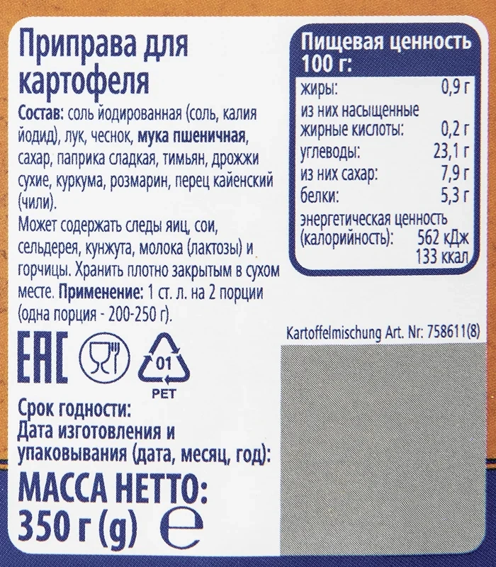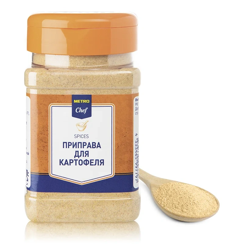Приправа Для картофеля METRO Chef, 350 г – смесь ароматных трав, пряностей и соли, предназначенная специально для приготовления блюд из картофеля. Продукт обладает сбалансированным, приятным запахом, не забивает вкус продуктов, а только подчеркивает его. Отлично подойдет для приготовления супов, борща, щей, жаркого, тушеных овощей. Вы можете добавить приправу в картофель, предназначенную для любой тепловой обработки.