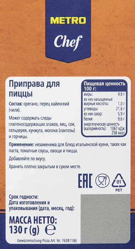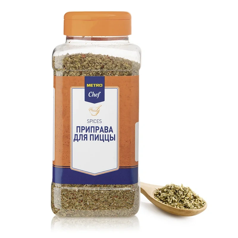 METRO Chef Приправа для пиццы, 130г — важный компонент при приготовлении этого традиционного итальянского блюда. Именно специи придают пицце уникальный и неповторимый аромат и подчеркивают вкус ее ингредиентов. Приправу можно добавлять не только в соус, но и в тесто — так вкус основы будет более насыщенным. Секрет данной смеси в том, что ее можно использовать не только для пиццы, но и для других блюд: мяса, салатов, картофеля. А если посыпать пряностями горячий бутерброд с сыром, то в сочетании с чашкой кофе он прекратится в настоящее изысканное блюло. В составе смеси использованы только натуральные компоненты, поэтому она отличается большим количеством содержащихся в ней полезных веществ: витамины группы В, С, Е, Н и PP, калий, кальций, фосфор, натрий, железо и многие другие.