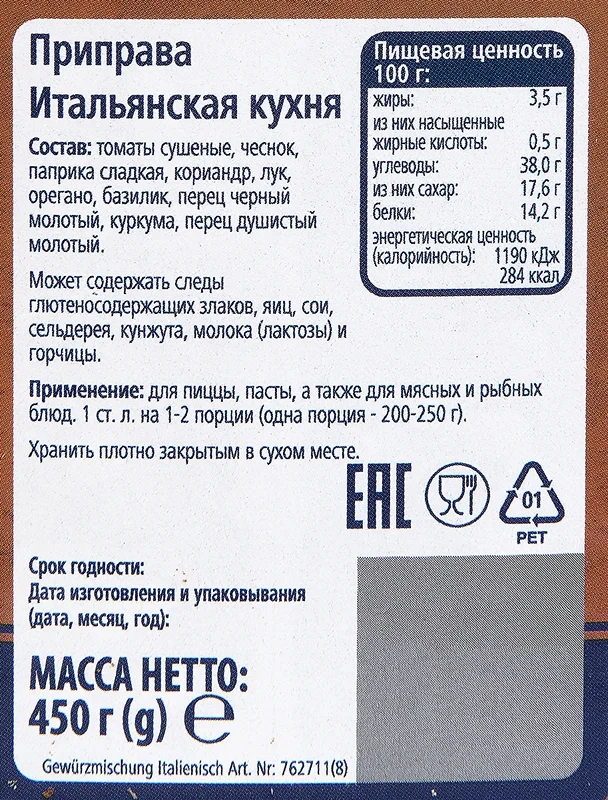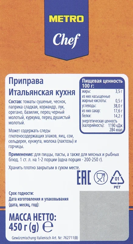 С помощью ароматных душистых трав, что входят в состав приправы Итальянская кухня METRO Chef, 450 г, можно разнообразить повседневную кухню и удивлять гостей необычными кулинарными решениями. Для того чтобы еда была вкусной и ароматной, их следует правильно использовать. Специи добавляются в последнюю очередь, тогда они не потеряют своих полезных качеств и сохранят свои ароматные композиции. Приправа станет незаменимым помощником в приготовлении широкого ассортимента блюд, таких как мясо, птица, рыба, салаты. Эту приправу так же хорошо добавлять в супы, томаты, сыры и маринады. Приправа придаст поистине итальянскую нотку спагетти, лазанье и пицце.