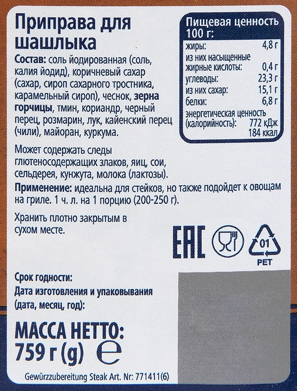 Приправа METRO Chef смесь для шашлыка, 790 г — это отличный способ разнообразить привычное блюдо. Ею можно натирать мясо перед приготовлением или добавлять прямо перед подачей. Результат всегда один — тонкий, нежный аромат трав, насыщенный вкус, волнующее послевкусие. Приправа хороша как в самостоятельном виде, так и в комбинации с другими специями — базиликом, сушеным луком или чесноком. Миксуя разные сочетания, можно каждый раз получать новые вкусы.