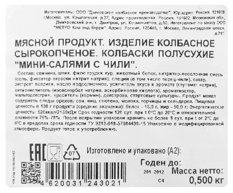 Metro Chef Салями мини Чили, 500г – это вкусное необычное мясное изделие, которое придется по вкусу любителям пикантных продуктов. Салями имеет яркий вкус и приятный аромат, обладает привлекательным срезом с равномерными кусками шпика. Основу изделия составляет свинина высокого качества. Продукт станет идеальным ингредиентом для приготовления канапе, салатов и других блюд. Благодаря небольшому размеру эти мини-колбаски не нужно разрезать и можно подавать к столу в готовом виде.