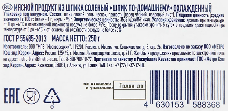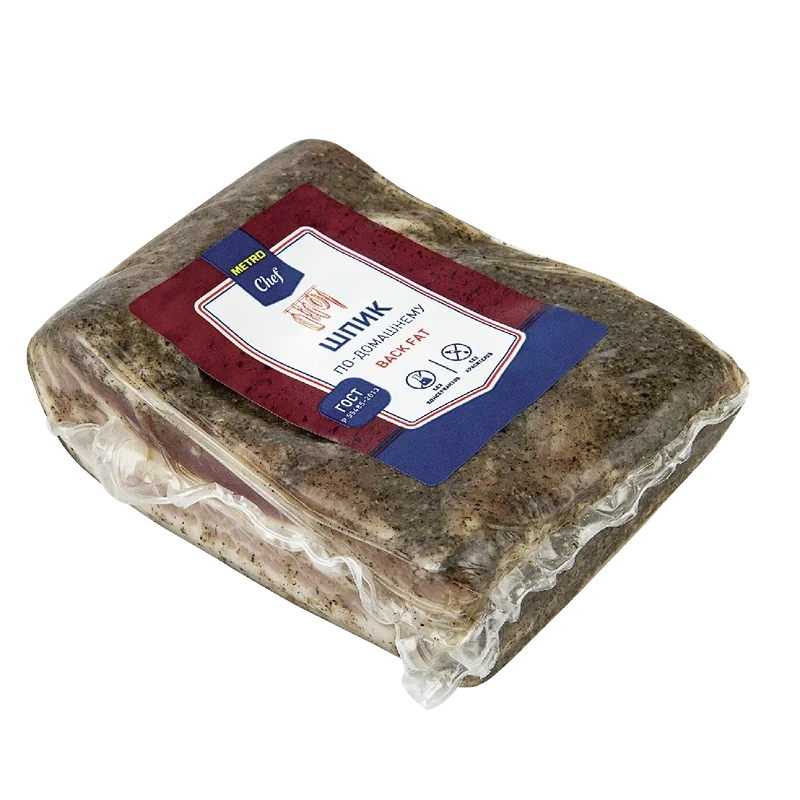 Metro Chef Шпик соленый по-домашнему, 250г — натуральное изделие, которое куском, без нарезки упаковано под вакуумом в пластиковый пакет. Используются шпик, соль и специи, которые хорошо просматриваются на поверхности продукта. Срез белоснежного цвета, текстура упругая, маслянистая, однородная. Классический рецепт посола использовался для создания традиционной русской закуски, которая исключительно хорошо сочетается с ломтиком бородинского хлеба и горячительными напитками. Шпик со специями является отличным дополнением к свежим овощам, жареным яйцам, горячей рассыпчатой картошке. Его можно использовать в зажарке для супов и каш, в начинке для блинов, в запеканках, рагу и т. п. Существует немалое количество рецептов, где может пригодиться этот продукт.
