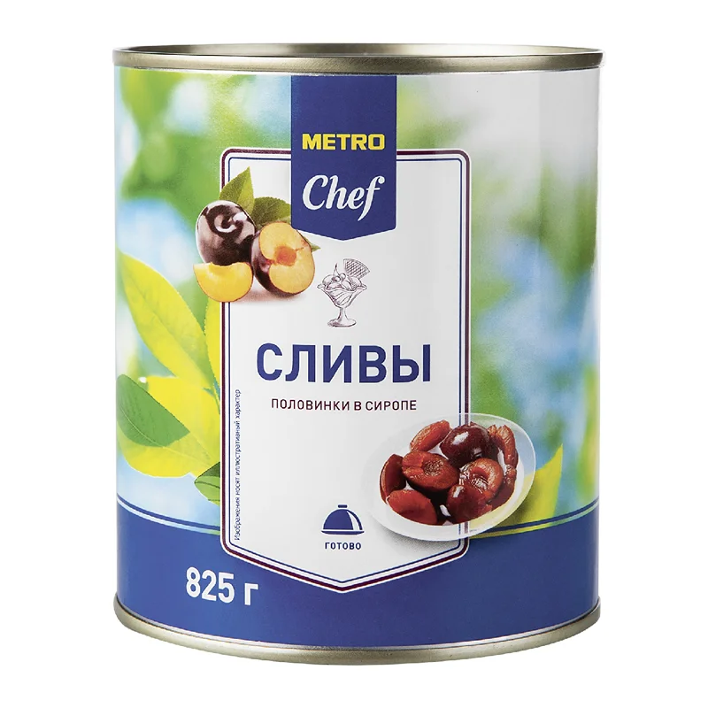 Слива Metro Chef красная в сиропе, 825 г – приготовленный путем консервирования полезный продукт, который обладает приятным и сладким вкусом. Сочные кусочки отборных плодов помещены в легкий фруктовый сироп. Их можно употреблять как самостоятельное лакомство, в качестве альтернативы свежим фруктам в весенний или зимний период, а также использовать для приготовления салатов, пирожных, пирогов, тортов и другой сладкой выпечки. Слива в сиропе не только вносит приятное разнообразие в привычный рацион, но и приносит пользу организму. Этот фрукт богат калием, цинком, медью, железом, витаминами, никотиновой, фолиевой, органическими кислотами и другими незаменимыми для здоровья компонентами. При включении в регулярное меню слива положительно влияет на работу органов желудочно-кишечного тракта, улучшает состояние сердца и сосудов, способствует выводу токсинов, повышает иммунитет. Продукт не требует хранения в холодильнике и помещен в надежную жестяную банку. Благодаря весу 825 грамм его хватит на несколько порционных употреблений.