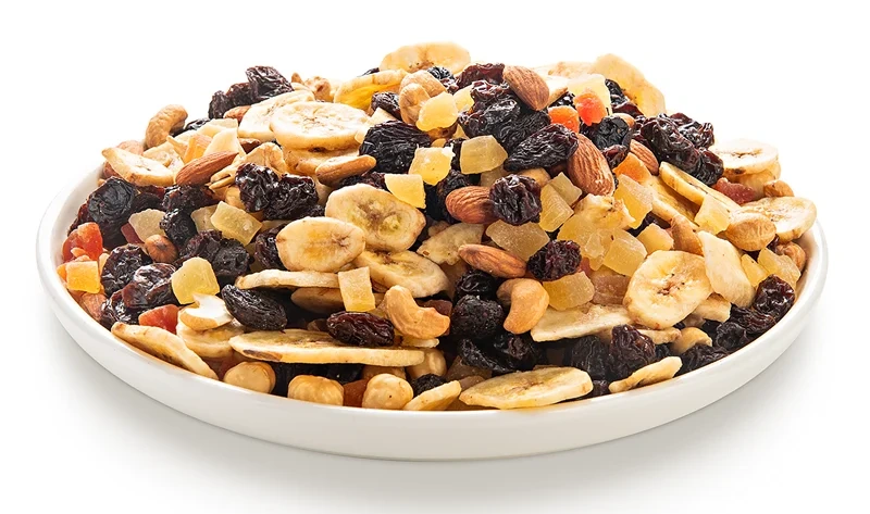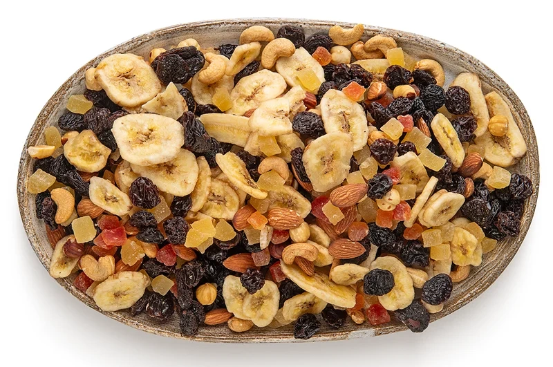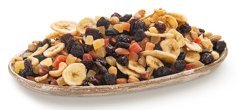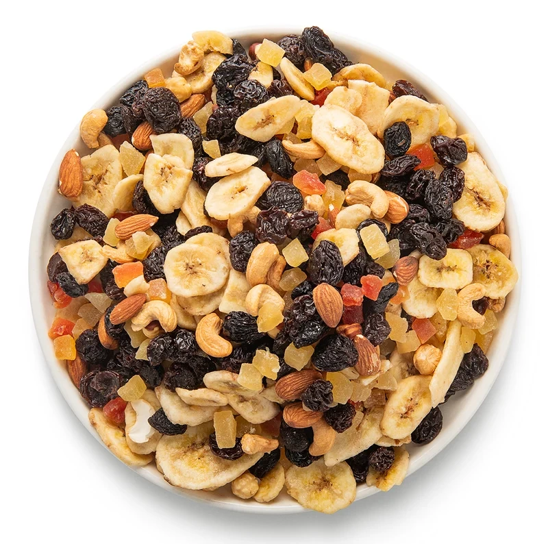 Вкусный и полезный снэк в практичной упаковке, состоящий из тёмного изюма, банановых чипсов, цукатов ананаса и папайи и жареных миндаля, фундука, кешью.