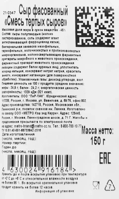 | Фасовка | тертый |