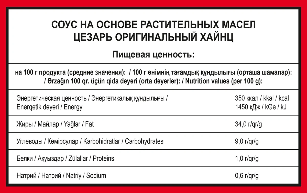 Вода, паста томатная, уксус винный, пюре яблочное, сахар, загустители: Е1422 и пектин, соль, масло подсолнечное, ароматизаторы (Хикори, Горчица), краситель натуральный: сахарный колер IV, чеснок сушеный, усилитель вкуса и аромата: глутамат натрия, стабилизаторы: Е412, Е415, консерванты: сорбат калия и бензоат натрия, вкусоароматические эмульсии: Черный перец, Кориандр, Красный перец, регулятор кислотности: кислота лимонная.