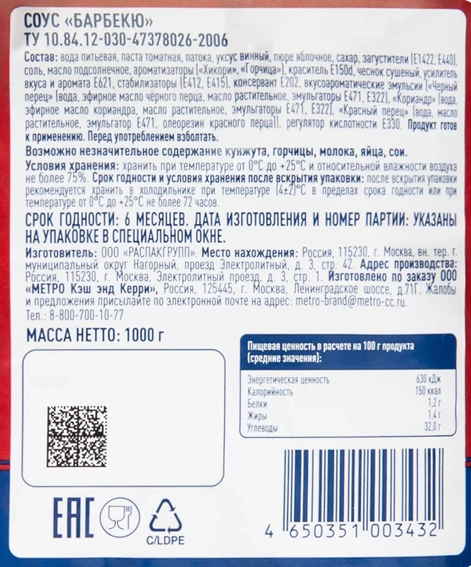 Соус Metro Chef барбекю - традиционный соус для маринования мяса и птицы перед приготовлением на гриле или мангале. Создает аппетитную карамелизированную корочку и придает блюду характерный дымчатый аромат. Универсален в применении - подходит для курицы, свинины, говядины и рыбы. Также подходит для добавления соуса непосредственно к готовым продуктам.