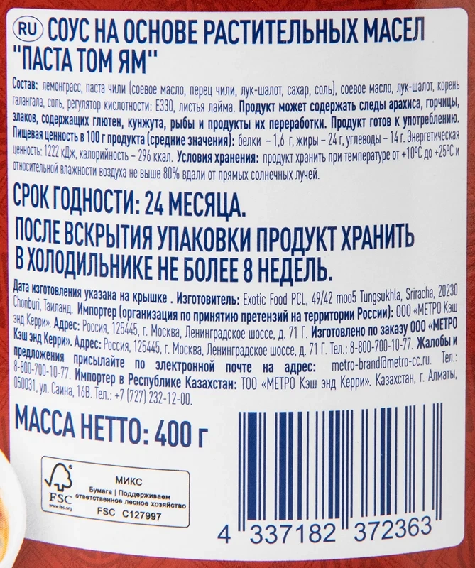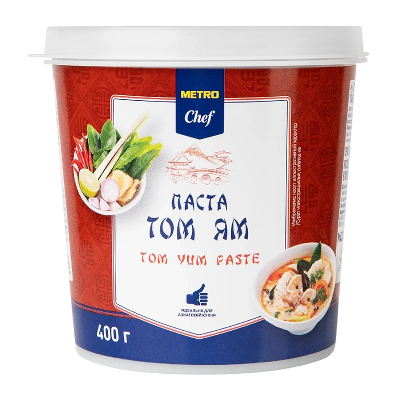 Паста для Том Яма METRO Chef - это ингредиент, позволяющий быстро приготовить ароматный Том ям, удивив им как гостей ресторана, так и друзей и родных дома. Имеет густую консистенцию с небольшим количеством волокнистых включений. Не содержит в составе глутамата натрия и ее цвет менее яркий. Пасты весом 400г в удобной пластиковой баночке хватит более, чем на 8 литров супа при высокой концентрации заправки, а долгий срок хранения после вскрытия позволит растянуть удовольствие на долгое время. Том ям обладает противоречивым сливочно-острым вкусом, который так полюбился многим посетителям ресторанов этнической кухни. Традиционное блюдо Таиланда и Лаоса можно приготовить с креветками, курицей, грибами или рыбой - суп получится аутентичным с любым из этих ингредиентов. Необходимо для супа и кокосовое молоко, которое придаст ему характерную сливочность. Подавать суп необходимо с рисом, который способен немного смягчить остроту блюда. Приятного аппетита!