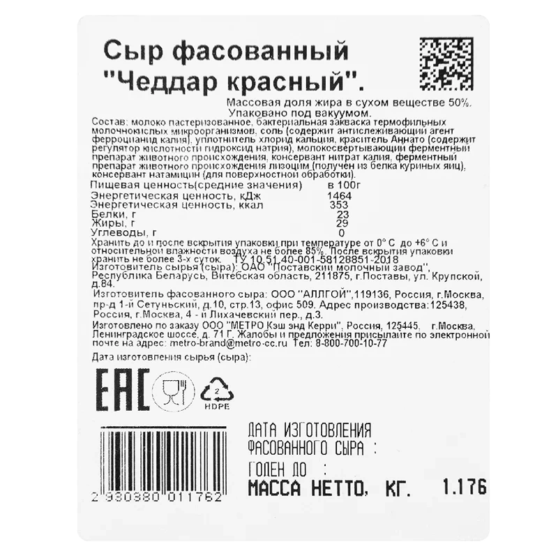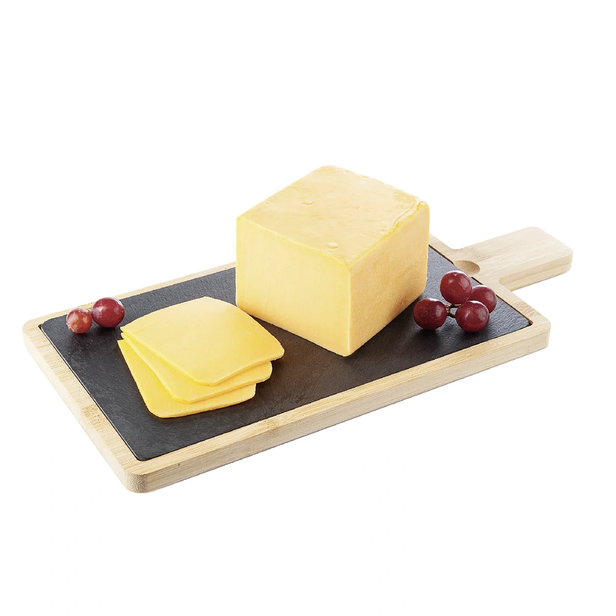 Сыр Metro Chef Чеддар 50%, красный, 1 кг изготовлен из коровьего молока без добавок и ГМО. Продукт характеризуется острым вкусом с резковатой кислинкой, гладкой и плотной текстурой, сливочным цветом с желтоватым оттенком. В состав полутвердого сорта сыра входят пастеризованное молоко, соль, бактериальная закваска молочнокислых микроорганизмов, безопасные красители. Польза чеддера обусловлена богатым составом минералов и витаминов группы В. Регулярное употребление сыра нормализует обмен веществ в организме. Продукт используется в кулинарии в качестве закуски, в сочетании с алкоголем, некоторыми блюдами: омлетами, бисквитами, мясной нарезкой. Чеддер хорошо дополняет вкус мяса, рыбы и овощей, входит в состав некоторых соусов. Его используют как основной ингредиент для гренок, канапе. Сырная нарезка поставляется в пластиковом контейнере, удобном для переноски и хранения, чтобы исключить его высыхание.