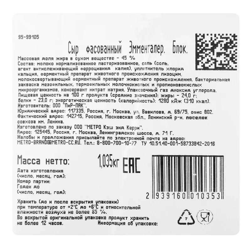 METRO Chef Сыр Эмменталер 45%, ~1кг