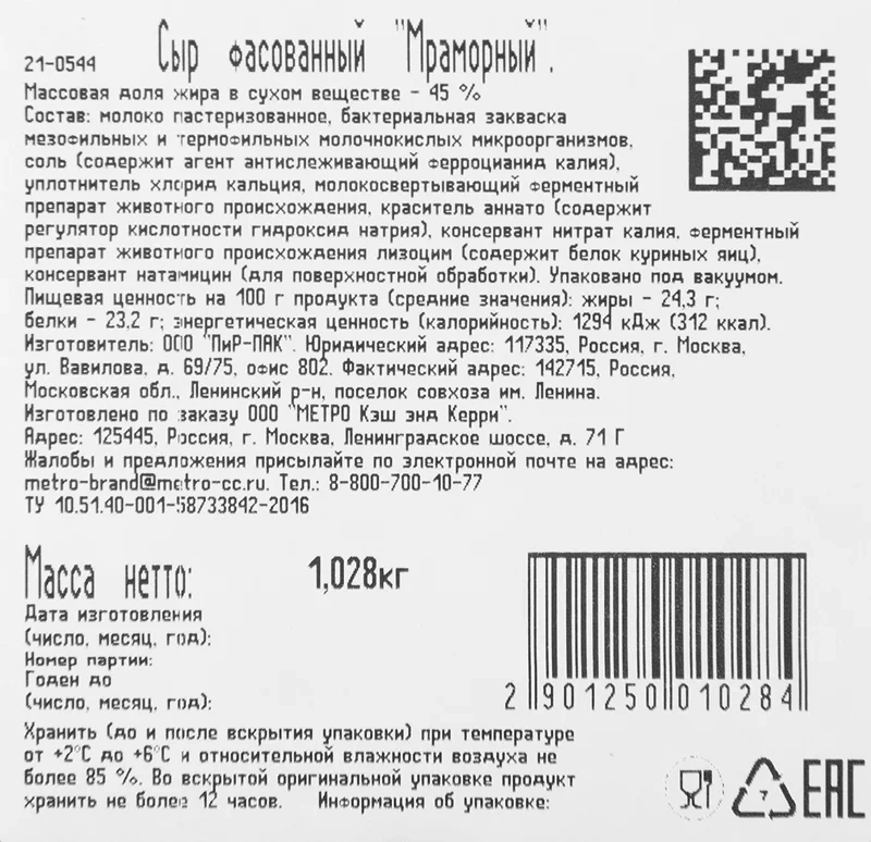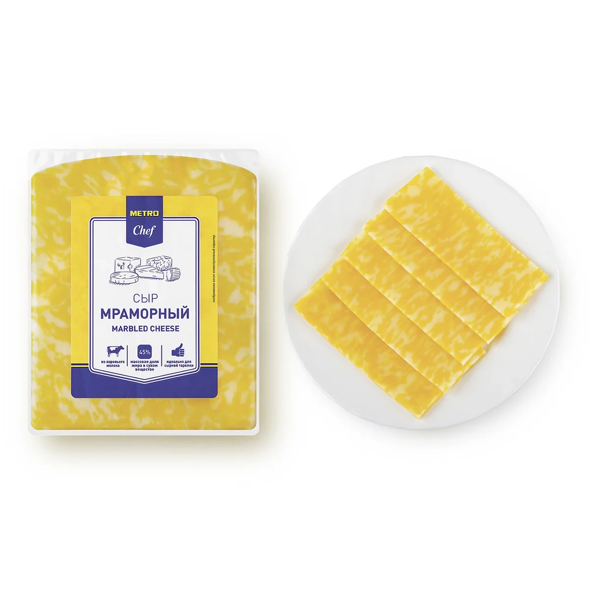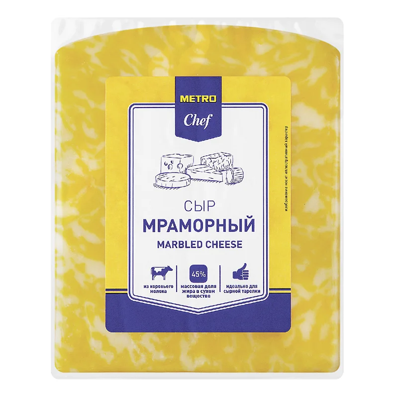 Metro Chef Сыр Мраморный полутвердый, 1кг БЗМЖ - это высококачественный сыр, который изготавливается из мраморного молока. Сыр Мраморный полутвердый, 1кг БЗМЖ имеет приятный вкус и аромат, а также отличается высокой консистенцией. Этот сыр идеально подходит для приготовления различных блюд, а также для нарезки и подачи как закуска.