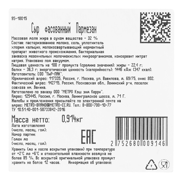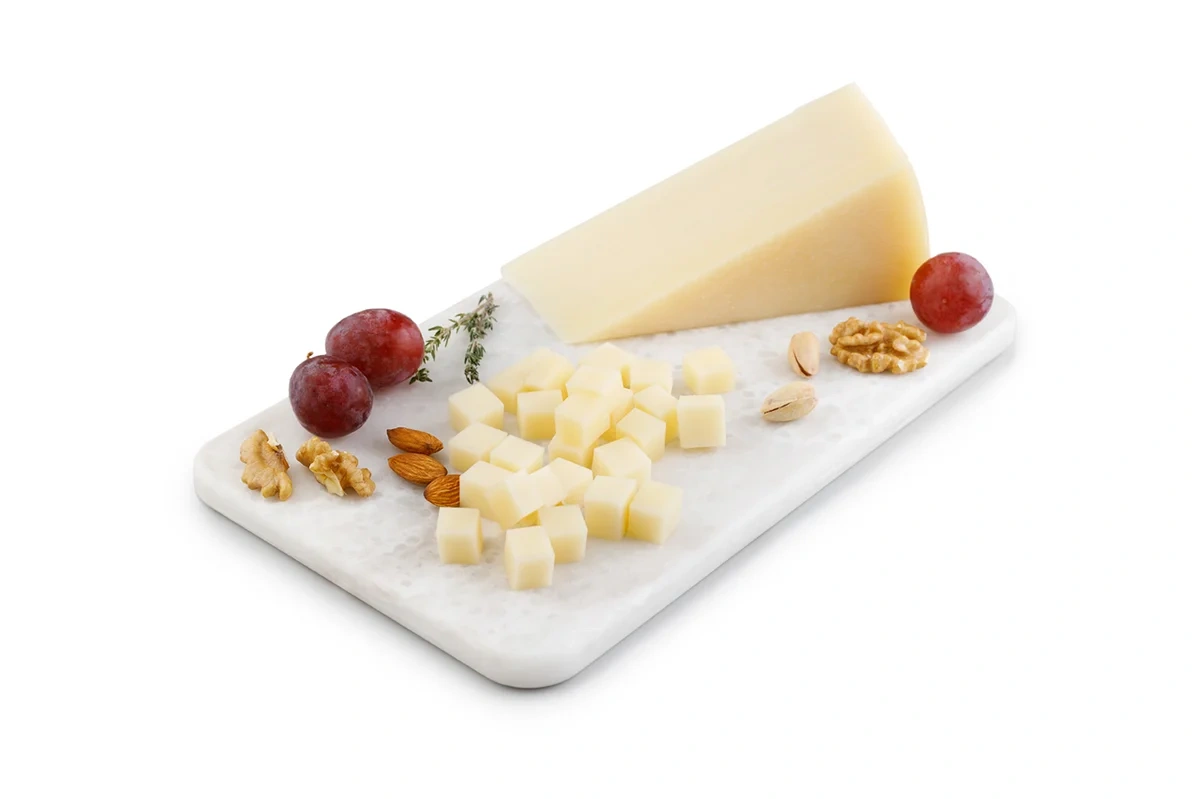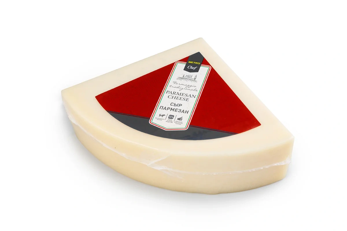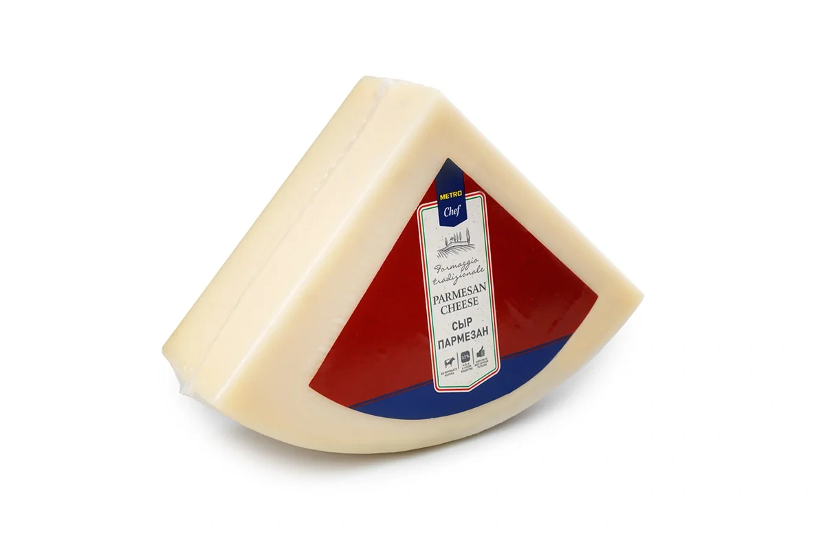 Metro Chef Сыр Пармезан кусок 32% – один из популярных сыров, приготовленных по классическому итальянскому рецепту. Он обладает плотной твердой консистенцией, светло-желтым цветом и насыщенным солоноватым вкусом, в котором ощущаются сладкие фруктовые и пикантные ореховые нотки. Продукт изготовлен на основе натурального пастеризованного молока, содержит соль, молокосвертывающий фермент и специальную закваску. Отличительная особенн??сть пармезана – возможность быстро плавиться при воздействии высоких температур, что расширяет возможности использования этого сыра. Пармезан можно предложить в качестве изысканной закуски к вину или портвейну. В тертом или нарезанном пластинками виде его добавляют в Нисуаз и другие салаты, посыпают им пасту под разнообразными соусами, запекают с фрикадельками. Он может выступать в качестве ингредиента для приготовления пиццы и всемирно известного соуса Песто или играть роль оригинальной панировки мясных блюд. Употребление пармезана приносит пользу организму. При включении в рацион пармезан быстро и легко усваивается, даря заряд бодрости и сил. Он способствует укреплению сердца и сосудов, улучшает состояние костной ткани, кожи и волос, ??ормализует пищеварение и работу органов желудочно-кишечного тракта, успокаивает нервную систему, повышает иммунитет.