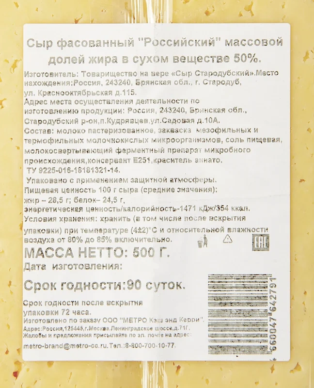 Metro Chef Сыр российский 50%, 500г БЗМЖ (без заменителя молочного жира) изготовлен с использованием заквасок мезофильных и термофильных молочнокислых организмов, молокосвертывающего фермента животного происхождения. Продукт обладает сбалансированным сладковатым вкусом с легкой кислинкой, прекрасно подходит в качестве закуски или ингредиента разных блюд. Сыр можно подать к белому вину, бутербродам, посыпать им пиццу, пасту или включить в начинку различных пирогов.