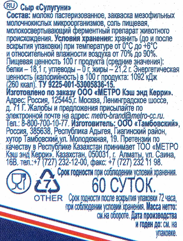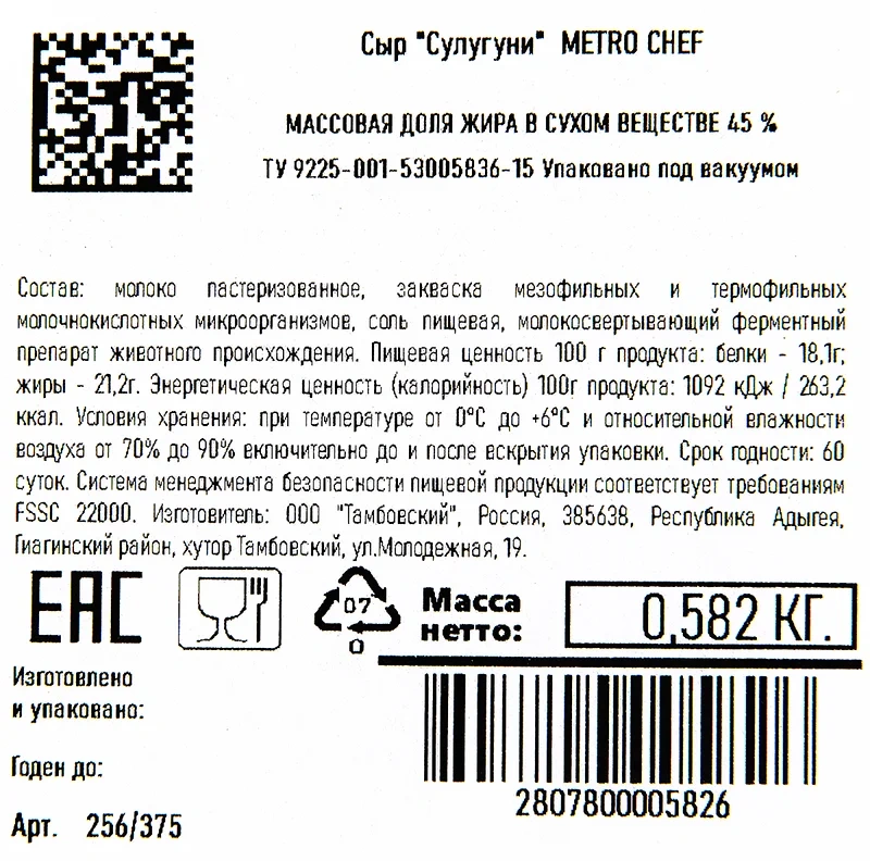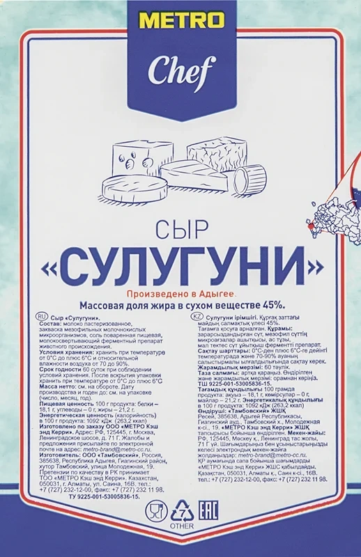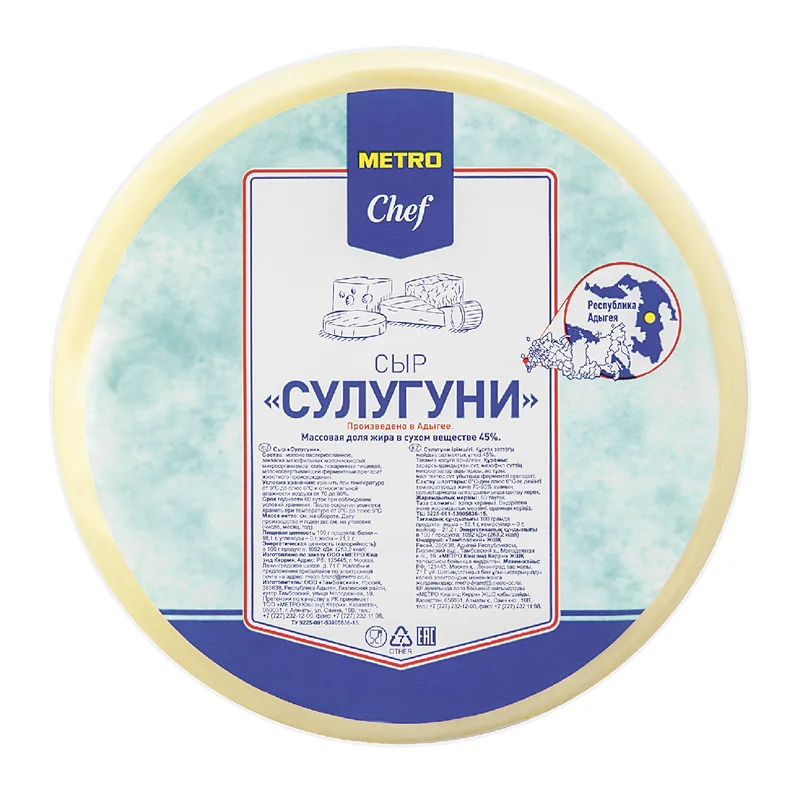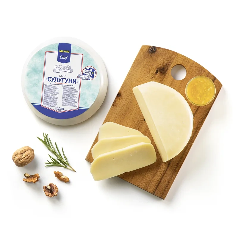Сыр сулугуни 45% METRO CHEF, весовой — это отличный вариант перекуса, а также дополнения к основному блюду. У продукта неплотная консистенция и нежный, нейтральный вкус. Сулугуни подходит для приготовления обычных и горячих бутербродов, отлично сочетается с любыми мясными и колбасными изделиями. Также сыр можно поджарить, получив таким способом тающую серединку и хрустящую, аппетитную корочку. Продукт считается отличным источником белка, а также таких элементов как кальций, фосфор, натрий. Продукт: сыр сулугуни.Молоко: коровье.Массовая доля жиры в сухом веществе: 45%.Состав: молоко пастеризованное, закваска мезофильных молочнокислых микроорганизмов, соль поваренная пищевая, молокосвертывающий ферментный препарат животного происхождения.Пищевая ценность на 100 г продукта: белки — 18,1 г, жиры — 21,2 г, углеводы — 0 г.Энергетическая ценность на 100 г продукта: 263,2 ккал.Условия хранения: хранить при температуре от 0 до +6 градусов.Срок годности: 60 суток.