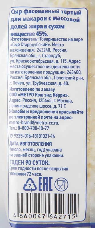 Metro Chef Сыр тертый для макарон 45%, 500г БЗМЖ. Этот мягкий сыр от Metro Chef идеально подходит для макаронных блюд. Сыр терт для макарон с большим содержанием молока имеет приятную кремовую текстуру и вкус.
