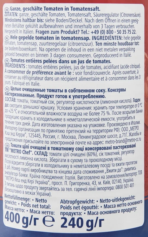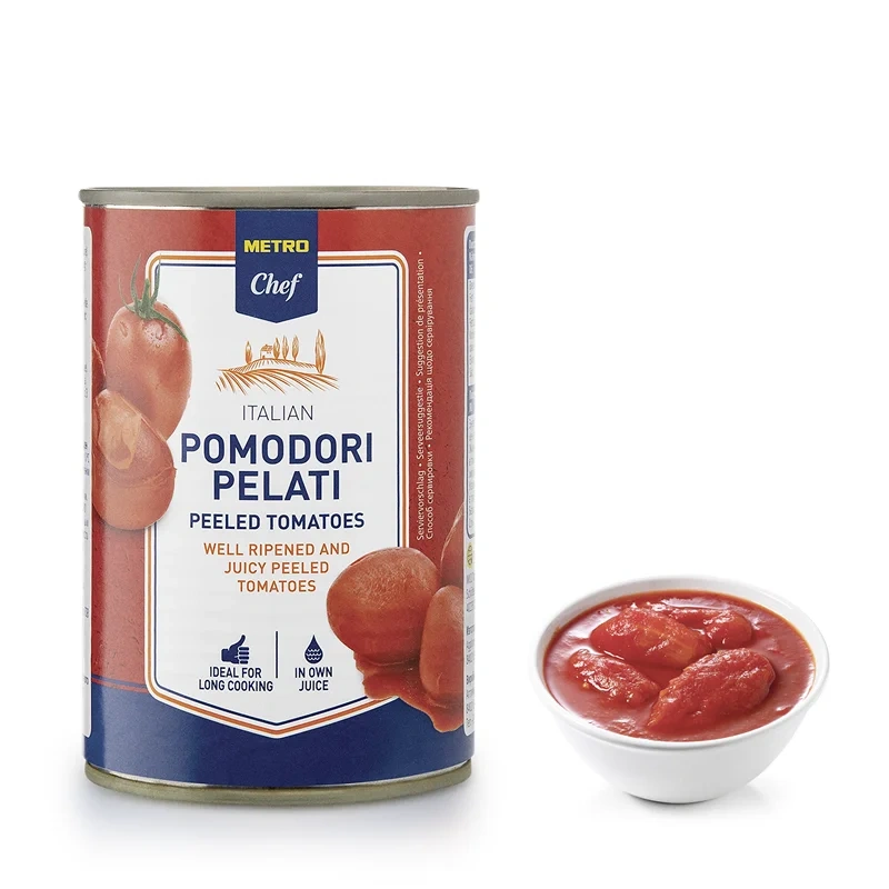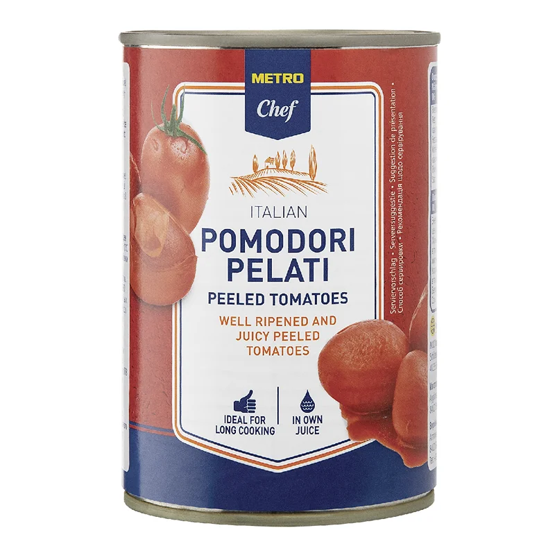Очищенные томаты Metro Chef - сочные и плотные томаты без кожицы в собственном соку. Томаты Metro Chef изготавливаются из отборных помидоров, собранных в момент идеальной спелости, обладают насыщенным цветом и ароматом! Идеальный компонент для изысканных блюд средиземноморской кухни!