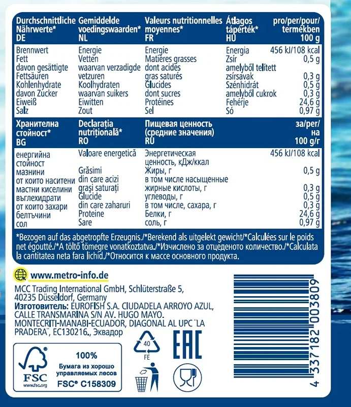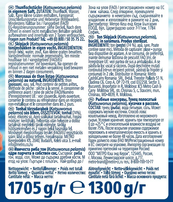 Тунец Metro Chef кусочки в рассоле, 1705 г – рыба из семейства ставридовых, обитающая в субтропических и тропических водах Индийского, Тихого и Атлантического океана. Она относится к деликатесным породам и высоко ценится кулинарными гурманами за нежное мясо и насыщенный яркий вкус. Как и другие виды рыб, тунец приносит большую пользу организму. Он богат незаменимыми для здоровья жирными Омега-кислотами, является природным источником белка, содержит аминокислоты, витамины группы В, А, РР, Е, а также натрий, кальций, магний, фосфор, хлор, йод, железо, селен и другие элементы. При регулярном употреблении в пищу этот продукт снижает риск развития болезней сердца и сосудов, служит профилактикой артрита, улучшает работу мозга и укрепляет иммунитет.