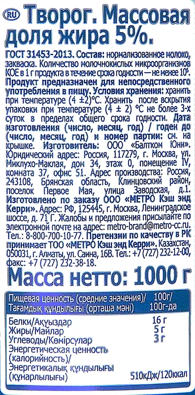 Творог 5% Metro Chef 1000 г – натуральный молочный продукт. Представленный творог характеризуется нежным и сливочным вкусом с легкой солоноватостью. Этот продукт – прекрасный и сбалансированный вариант для полезного завтрака. Его можно сочетать с любимыми фруктами, ягодами, орехами, джемом или топпингом. Также такой творог – удачная основа для нежных сырников и запеканки. Его можно применять в качестве начинки для блинчиков и выпечки. Творог – полезный продукт для здоровья взрослых и детей. В нем содержится большое количество витаминов, минералов, в частности, кальция и фосфора, а также легкоусвояемых белков.