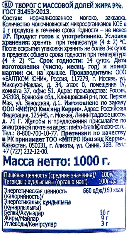 Творог Metro Chef 9% весом 1 кг – полезный и вкусный кисломолочный продукт. Обладает сбалансированным, нежным вкусом, зернисто текстурой и отсутствием яркого кислого послевкусия. Изготавливается из натурального коровьего молока по старинным рецептам, прекрасно сочетается с разными продуктами. В кулинарных рецептах многих стран и народов существует огромное количество блюд, приготовленных из творога. Для российского человека – это ватрушки, вареники, пироги, сырники и многие другие. У народов Кавказа творог больше используется в подсоленном виде в сочетании с разнообразными специями и зеленью. С ним готовят разнообразные салаты, закуски, лепешки.