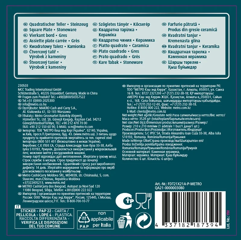 METRO PROFESSIONAL Блюдо Macario квадратное белое 21см, 6шт не накапливает запахи и не окрашивается в цвет продуктов. Легко моется с сохранением первоначального вида. Может использоваться как элемент столового набора для индивидуальной сервировки на каждое посадочное место, а также для подачи блюд. Подходит для подачи различных блюд, начиная от аппетитных закусок и нарезок и заканчивая горячими блюдами.
