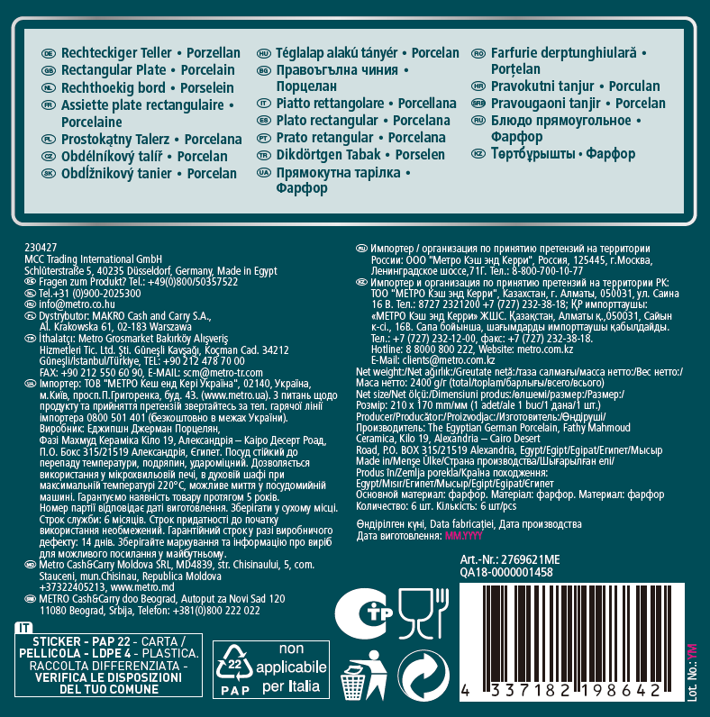 METRO PROFESSIONAL Блюдо Modern прямоугольное 21 x 17см, 6шт - изделие не накапливает запахи и не окрашивается в цвет продуктов. Легко моется с сохранением первоначального вида. Может использоваться как элемент столового набора для индивидуальной сервировки на каждое посадочное место, а также для подачи блюд. Предназначено для подачи горячих блюд: мяса, птицы, рыбы с гарниром и овощами, а также холодных блюд. Изделие отлично подойдет для подачи любой нарезки: мясной, сырной, овощной. Выпечка и фрукты тоже будут смотреться оригинально в овальной форме. Сервировочное блюдо можно мыть в посудомоечной машине и использовать в микроволновой печи без потери качества.