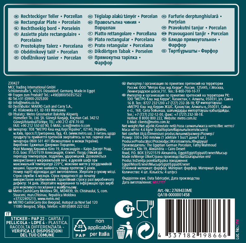 METRO PROFESSIONAL Блюдо Modern прямоугольное 33 x 26см, 4шт - изделие не накапливает запахи и не окрашивается в цвет продуктов. Легко моется с сохранением первоначального вида. Может использоваться как элемент столового набора для индивидуальной сервировки на каждое посадочное место, а также для подачи блюд. Предназначено для подачи горячих блюд: мяса, птицы, рыбы с гарниром и овощами, а также холодных блюд. Изделие отлично подойдет для подачи любой нарезки: мясной, сырной, овощной. Выпечка и фрукты тоже будут смотреться оригинально в овальной форме. Сервировочное блюдо можно мыть в посудомоечной машине и использовать в микроволновой печи без потери качества.