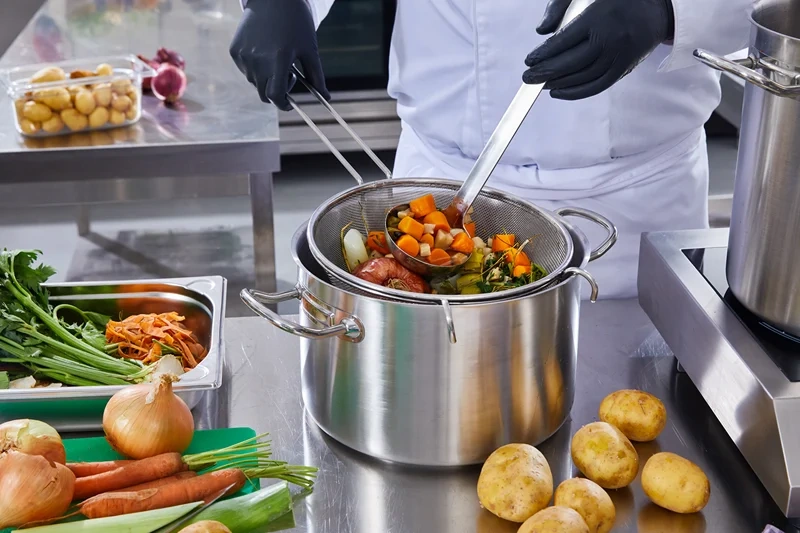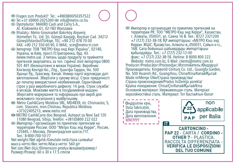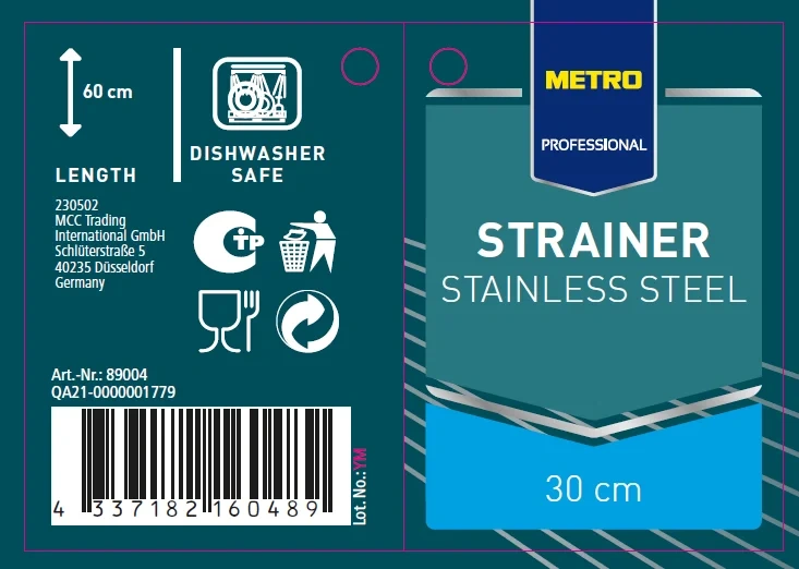 Это незаменимый на каждой кухне предмет, который пригодится в процессе приготовления различных блюд. Мелкая сетка позволяет эффективно и быстро сливать лишнюю жидкость. Держатели специально спроектированы так, чтобы дуршлаг удобно помещался на кастрюле (диаметр 30см). Длинная ручка (60см) предотвращает попадание горячего пара на кожу рук. Дуршлаг поможет легко процедить макароны и различные виды пасты, отварные овощи и компоты, промыть рис и фрукты. Дуршлаг изготовлен из высококачественной нержавеющей стали 18/8, которая обладает высокими антикоррозийными свойствами, не боится высоких и низких температур, окисления и царапин. Изделие можно очищать как ручным способом, используя мягкие моющие средства, так и в посудомоечной машине. После дуршлаг следует просушить.