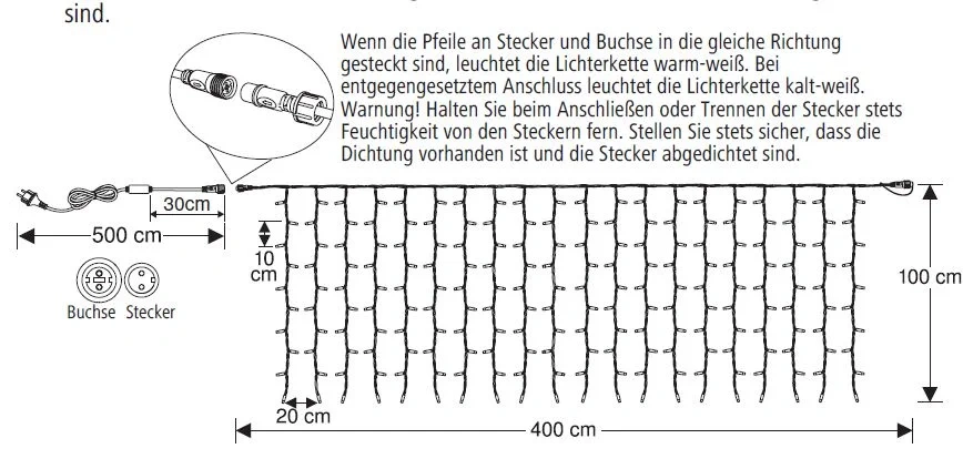 Меняйте настроение освещения по своему желанию! Уникальная гирлянда-занавес с переключением между теплым и холодным белым светом. Хотите уютное золотистое свечение для романтического вечера или яркое белое для праздничного торжества? Эта гирлянда подарит вам обе возможности! Прочный резиновый кабель выдержит даже суровую уличную погоду, создавая безупречное освещение для фасада, сада или интерьера.