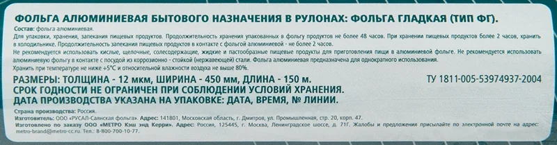 Фольга алюминиевая Metro Professional 12мкрн, 45см х 150м