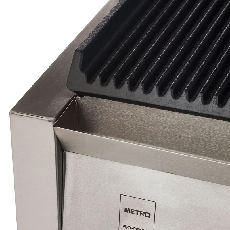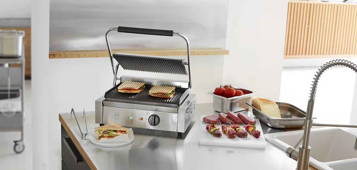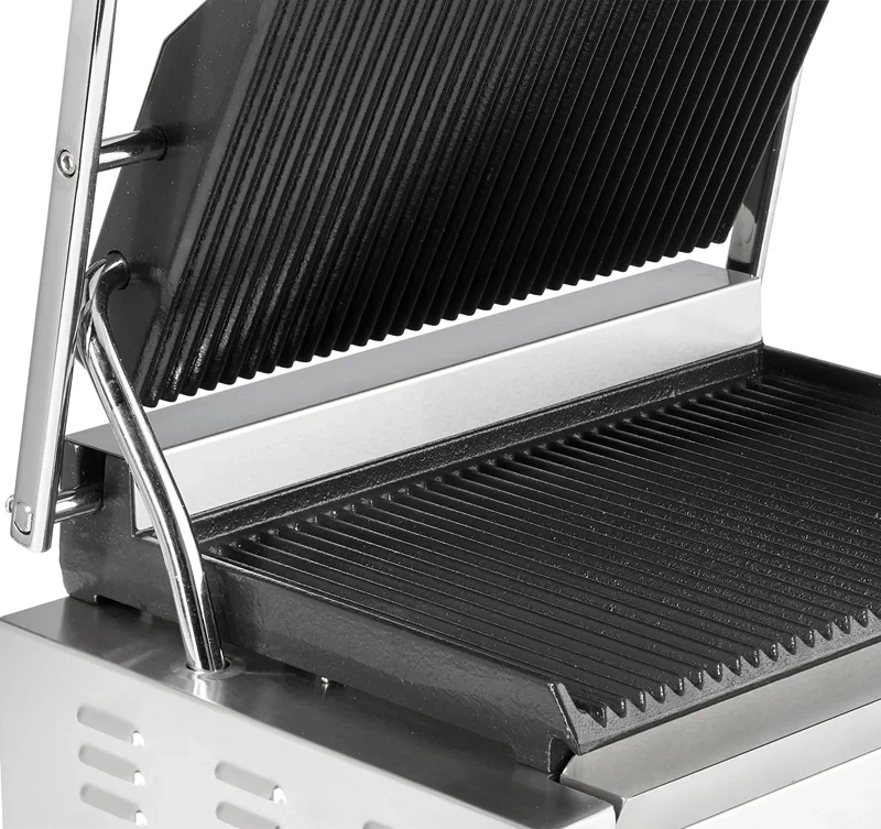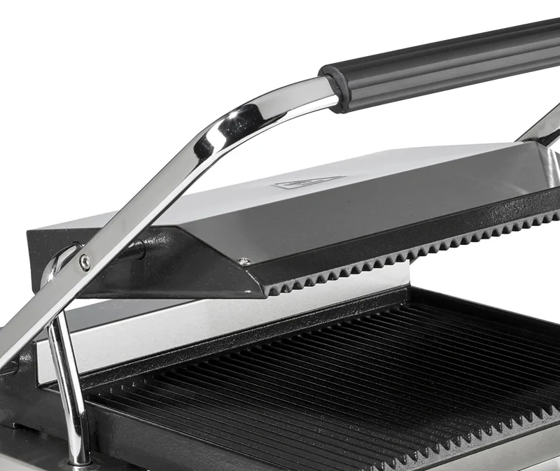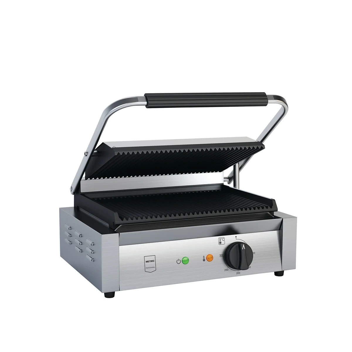 METRO PROFESSIONAL Гриль электрический GPG1201 контактный представлен в компактном размере, благодаря чему поместится в любом удобном для вас месте. Устройство простое в уходе и не вызовет сложностей в эксплуатации. Это универсальная модель, работающая от электросети и предназначенная для жарки, запекания или разогрева пищи. На гриле можно приготовить самые разнообразные продукты: мясо, птицу, сосиски, овощи, бекон, рыбу, креветки и другие морепродукты. Устройство незаменимо для создания сочных гамбургеров, горячих сэндвичей и полезных овощей-гриль.